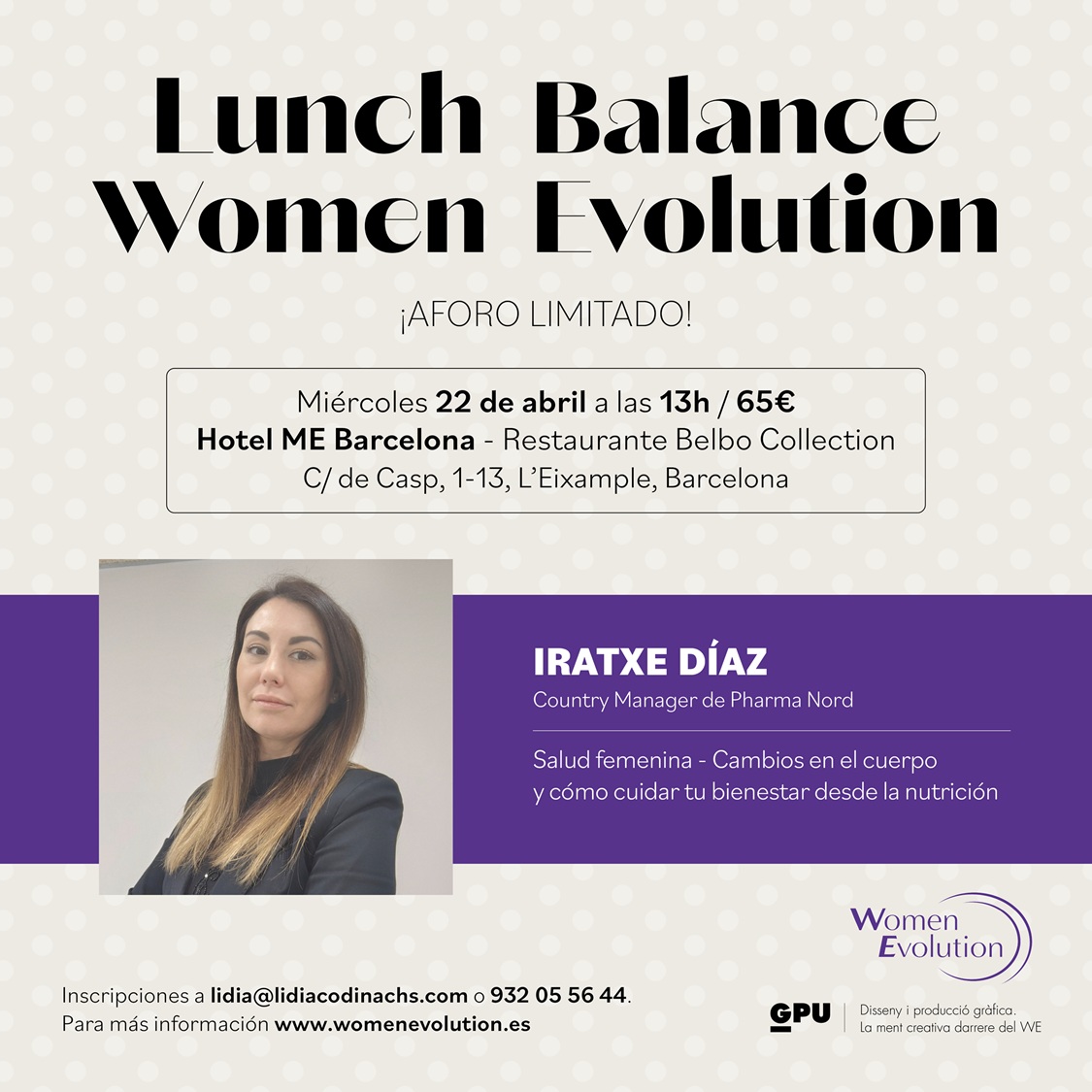 Women Evolution lanza un nuevo e interesante lunch en el mes de abril enfocado en el cuidado del bienestar de las mujeres a través de la nutrición con Iratxe Díaz Ascasso, bióloga, con una ampliam formación en Nutrición y Neurociencias. Es Country Manager de Pharma Nord España una especialista con gran experiencia en los cambios biológicos que experemientamos las mujeres con el paso de los años y cómo podemos abordarlos a través de una nutrición inteligente y personalizada.